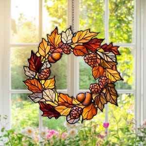 Autumn Wreath Acrylic Suncatcher Window Hanging Decoration, Fall Leaves Ornament, Thanksgiving Gift